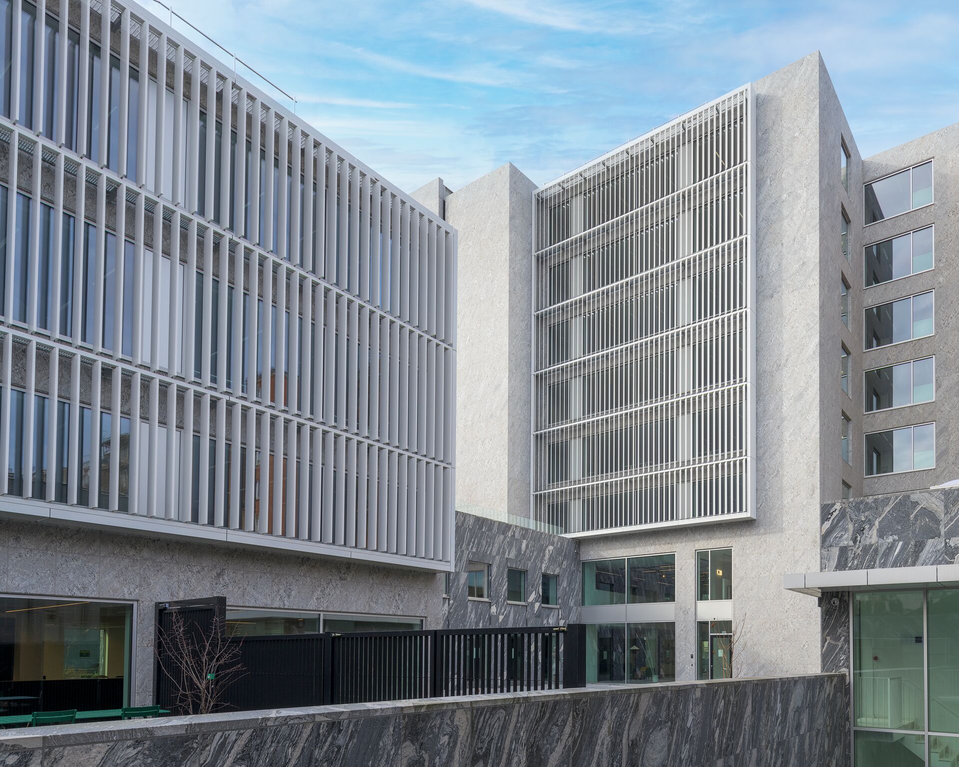 Staalbeton, en met name zijn metaalschrijnwerkerij, heeft een groot aandeel in de aantrekkelijke uitstraling van de volledig vernieuwde achterzijde. De veelvuldige stalen trapleuningen en passerellen creëren een luchtige, eigentijdse sfeer. Ook de vaste stalen structurele zonwering voor alle ramen geven het geheel een extra cachet. Deze zonweringen bieden trouwens niet alleen een grote esthetische meerwaarde aan het gebouw. Wanneer de zon op zijn hoogst staat in de zomer, zorgt de oriëntatie van de verticale lamellen voor schaduw, zonder het zicht naar buiten te belemmeren. Zo blijft de temperatuur binnenshuis onder controle. In de winter wordt het zonlicht van de laagstaande zon dan weer binnengetrokken, wat leidt tot een aangename natuurlijke warmte.